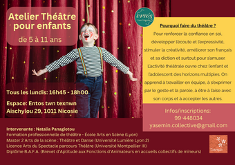 Tous les lundis 16h45-18h00 à Nicosie, Entos twn texnwn (Aischylou 29 street, 1011). Les cours, organisés par le collectif Yasemin, se déroulent en français. Premier cours d’essai gratuit. Infos/inscriptions : 99 44 80 34 - Cette adresse e-mail est protégée contre les robots spammeurs. Vous devez activer le JavaScript pour la visualiser.. Inscriptions jusqu'à la fin de novembre.