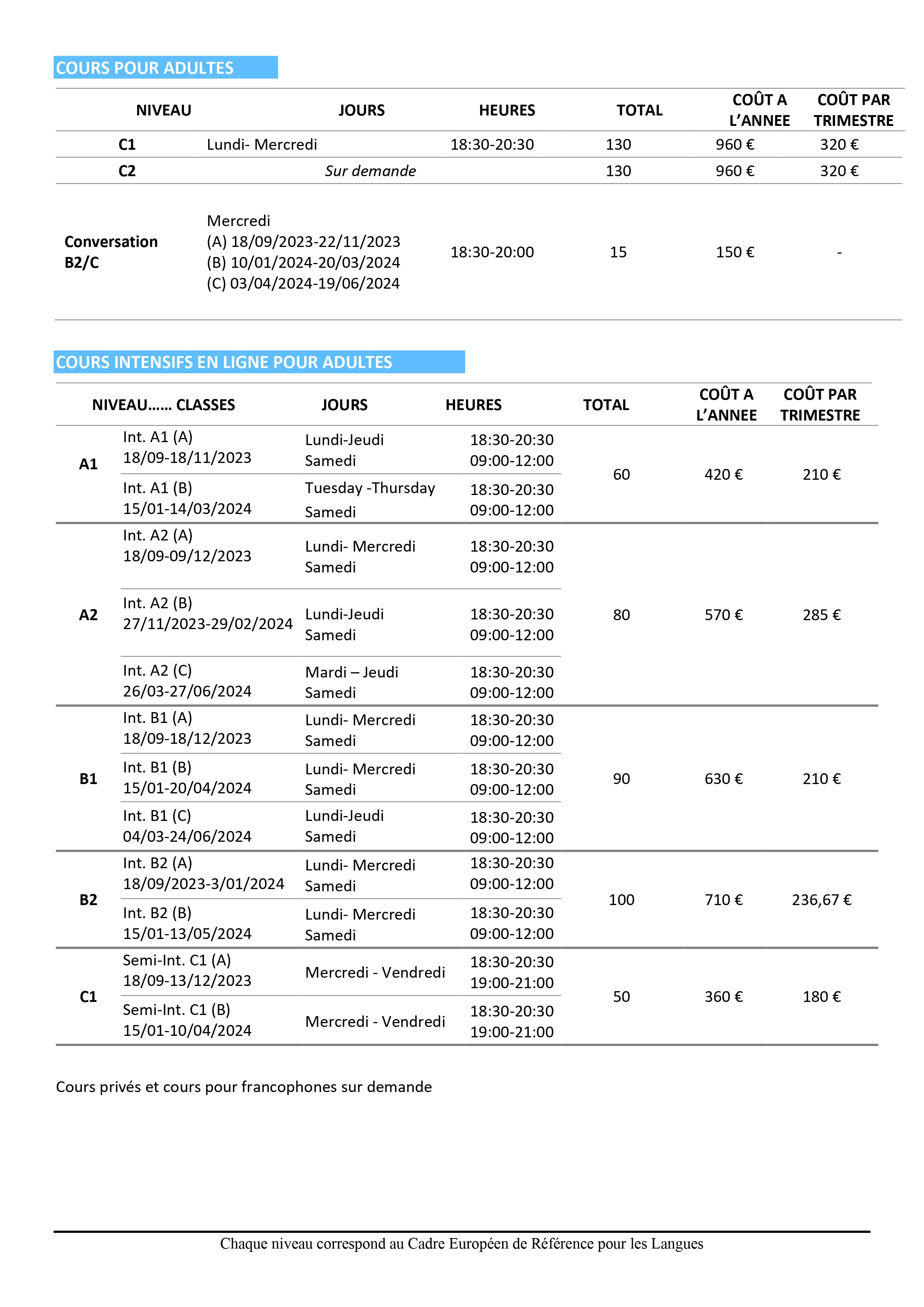 Cours annuels en présentiel 2023 - 2024 - Adultes COURS ANNUELS ADULTES 2024-2025 Cours d'été en ligne pour adultes