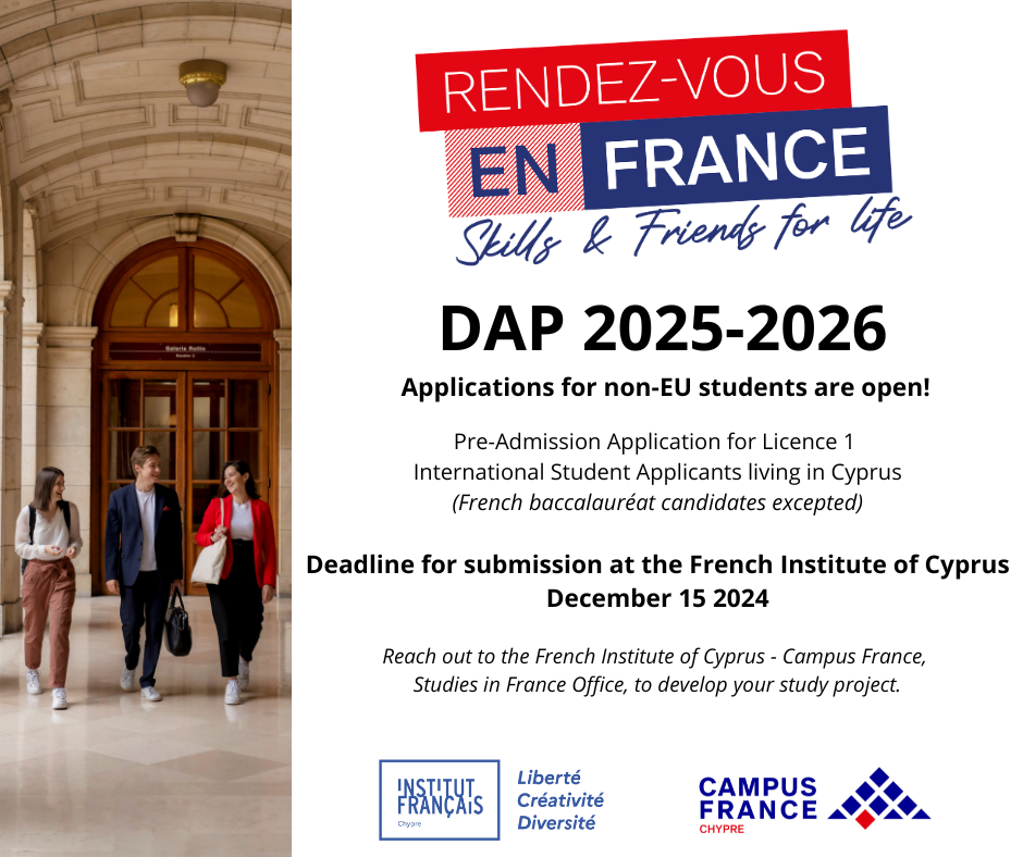 Les étudiants qui résident en Europe sans avoir la nationalité d'un pays européen et qui souhaitent s'inscrire en France en première année d'une formation de niveau licence dans une université française doivent déposer une demande d'admission préalable (DAP). Elle doit être faite entre les mois d'octobre et de décembre précédant l’année universitaire durant laquelle ils souhaitent débuter leurs études en France. A Chypre, nous traitons :